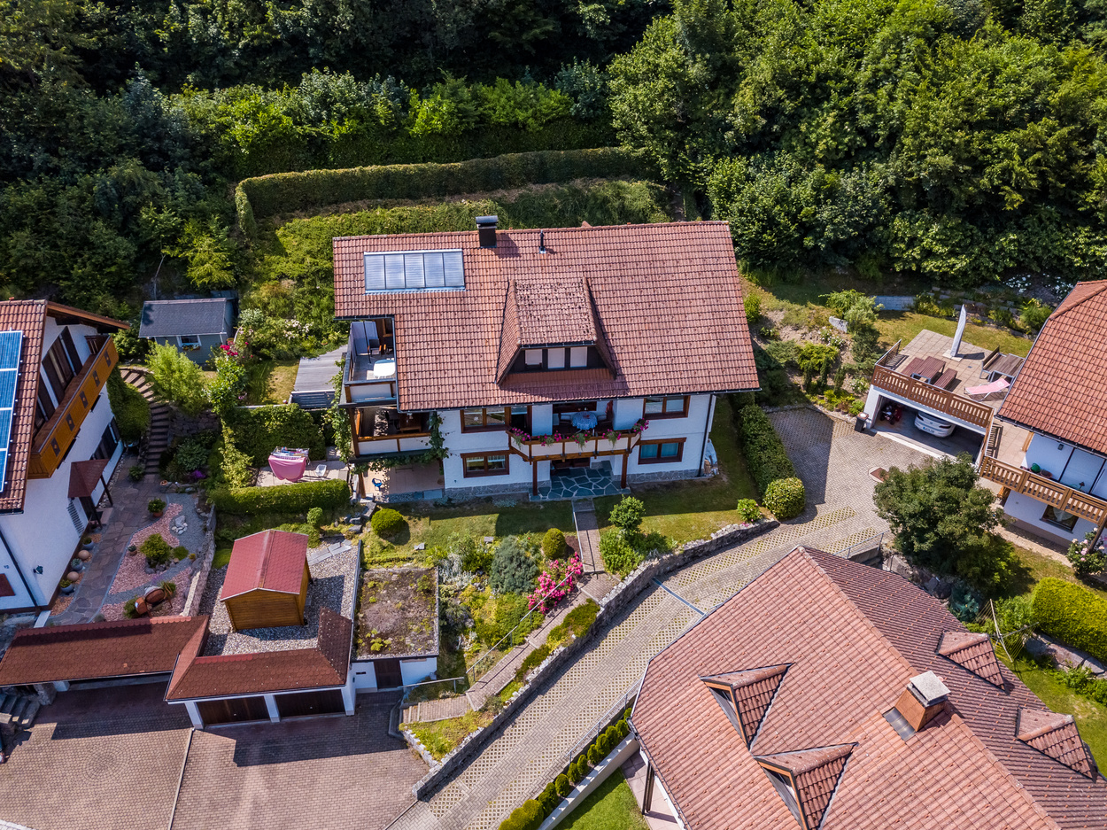 Luftaufnahme des Hauses  - Wohnzimmer mit Ecksofa und TV  - Balkon mit Holztisch und vier Stühlen im Hintergrund der Blick auf die grünen Wälder und Wiesen - Doppelschlafzimmer  - Badezimmer mit zwei Waschbecken und Toilette  - runder Esstisch mit vier Stühlen im Hintergrund die Küchenzeile - Blick auf Schönau im Schwarzwald  -