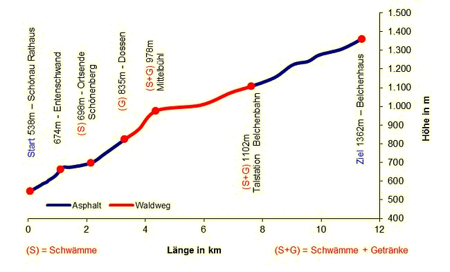 Nachfolgend erhalten Sie eine Übersicht über das Höhenprofil des Belchen Berglaufes. Eingezeichnet sind hier auch die Verpflegungsstationen.